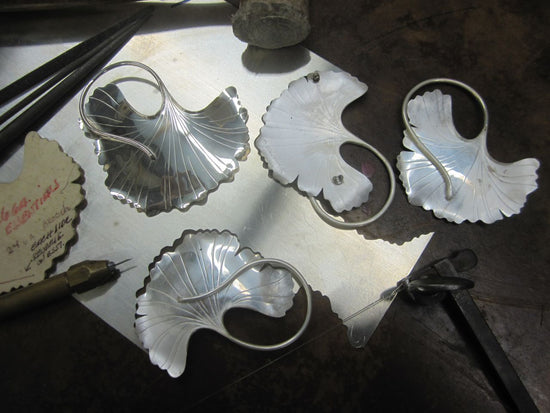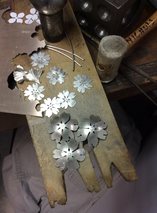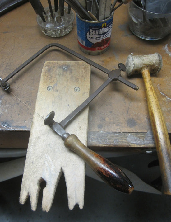 My daily tools are my bench pin, saw frame and saw blades, and rawhide mallets, along with copious other tools to form flat sheets of metal into dimensional beauty.